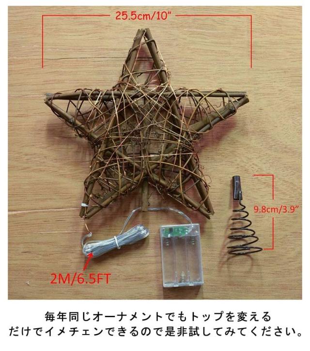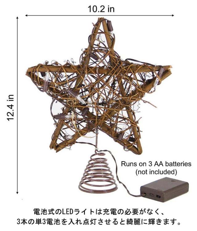 | ナチュラルの藤編みのトップスター。【電池式LEDライト付き】 そのままツリーのトップに押すだけでオッケー! LEDライト付きでキラキラ光り輝く存在感。 空間に溶け込みやすいナチュラルカラーのライト付きバージョンもあります。 飾るだけでさらに素敵なツリーに変身。 毎年同じオーナメントでもトップを変えるだけでイメチェンできるので是非試してみてください。 電池式のLEDライトは充電の必要がなく、3本の単3電池を入れ点灯させると綺麗に輝きます。 | |