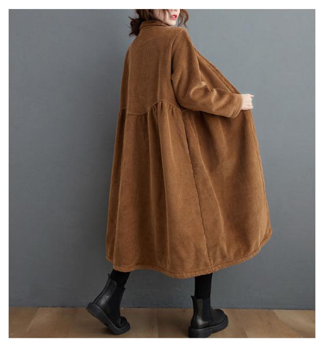 | 【ロングコート・ワンピース】【裏起毛・暖かい】【4color】 シンプルでスタイリッシュなレディースロングコート。 コーデュロイ生地は肌触りが柔らかく、ゆったりとした着心地です。 女性らしい綺麗なシルエットで一枚でお洒落な雰囲気が完成します。 普段使いはもちろん、通勤やお出かけなど様々なシーンで使えます。 | |