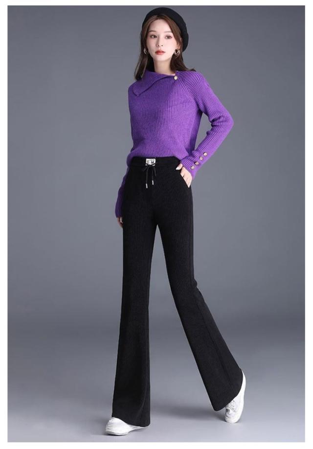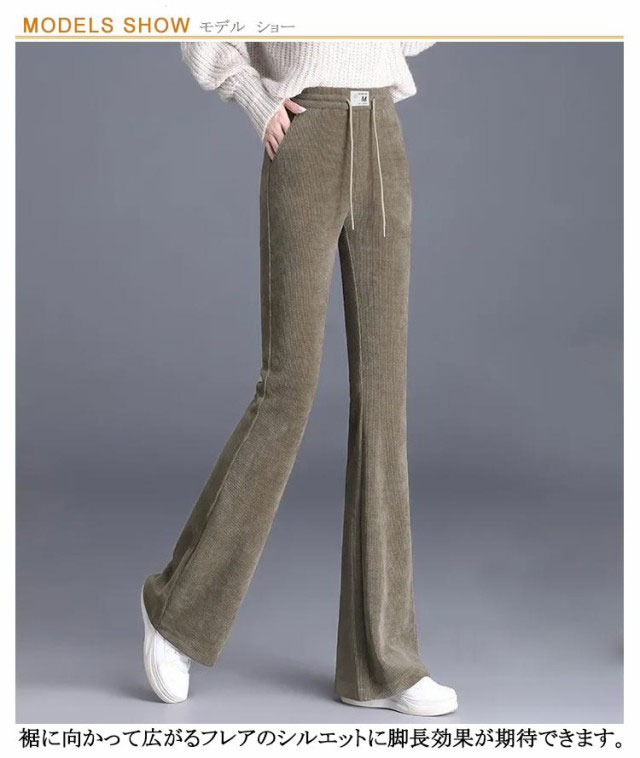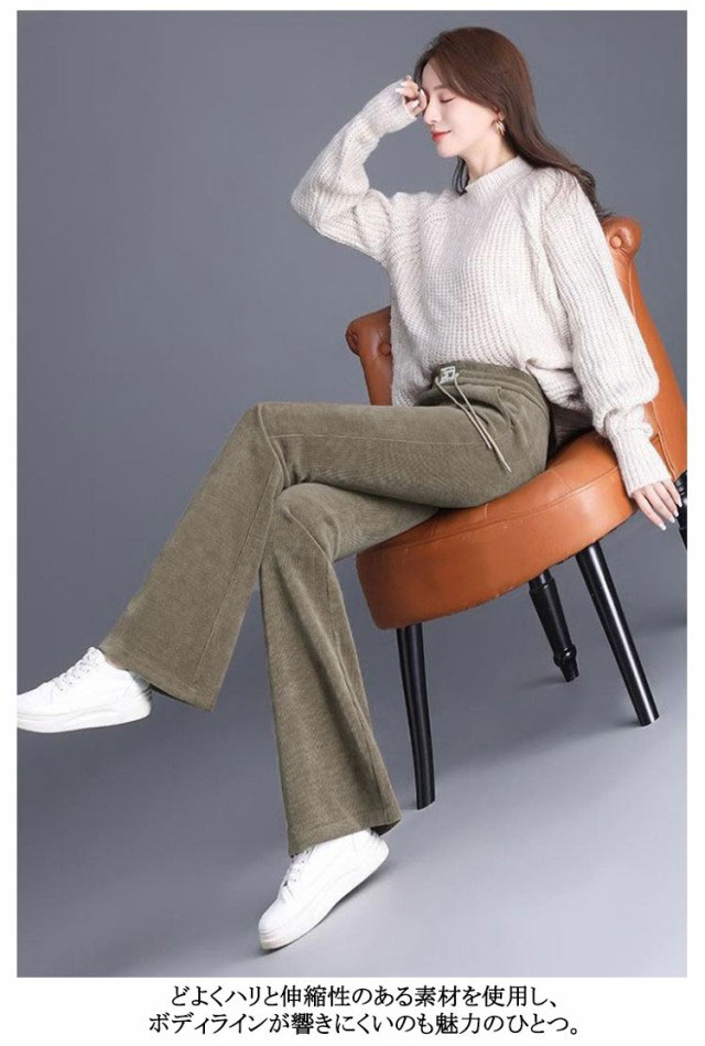 | 寒い冬には欠かせない、暖かく、肌触りの良い裏起毛フレアパンツ。 裾に向かって広がるフレアのシルエットに脚長効果が期待できます。 どよくハリと伸縮性のある素材を使用し、ボディラインが響きにくいのも魅力のひとつ。 ウエストは紐+ゴム仕様なのでストレスフリーな履き心地です。 | |