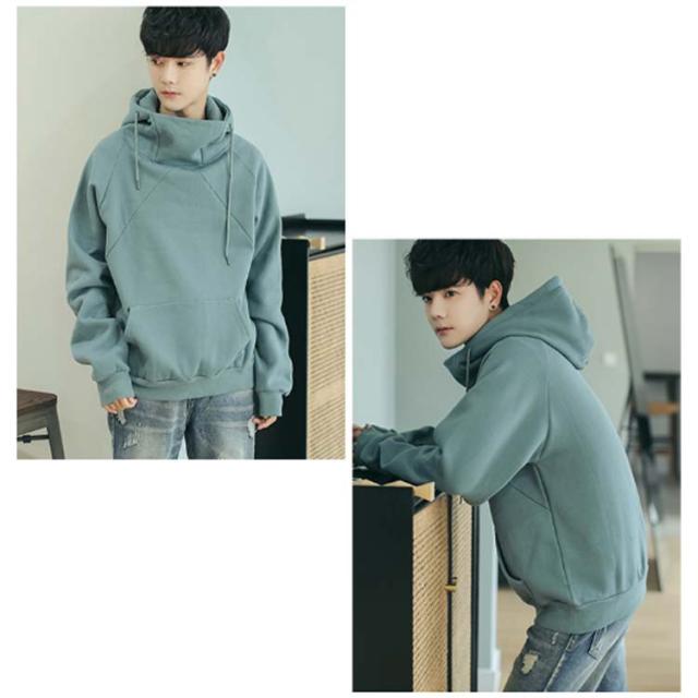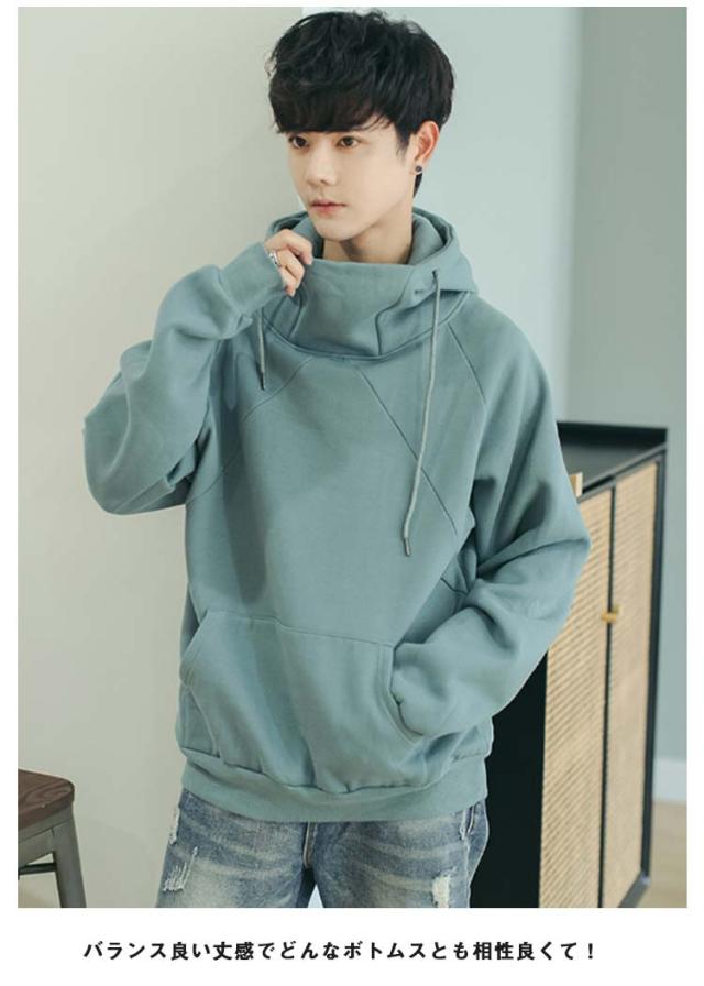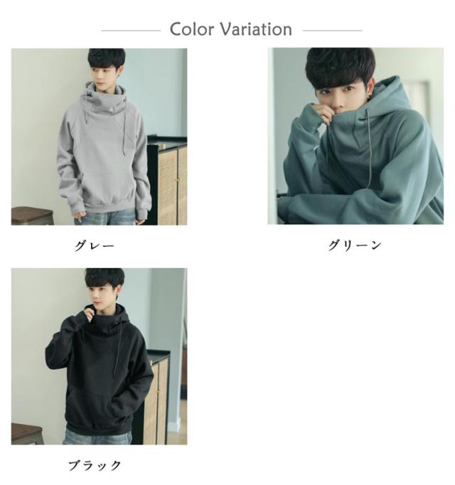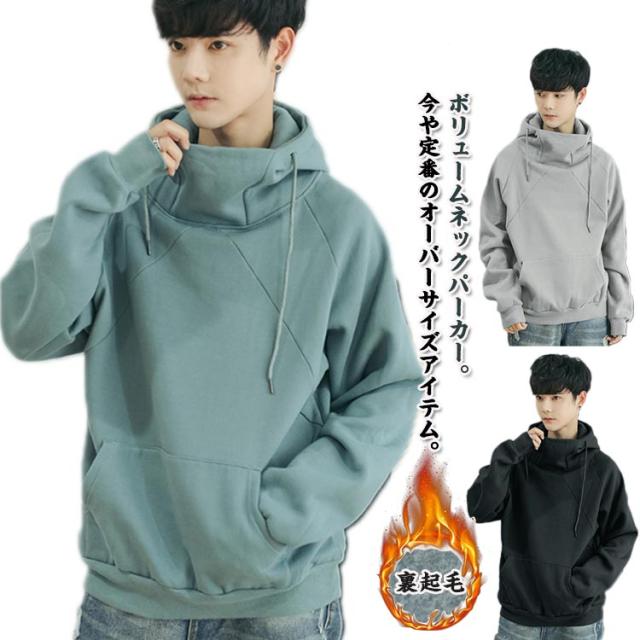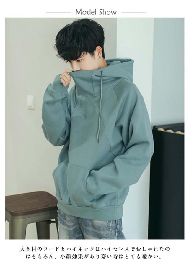 ハイネック 秋冬 グリーン ボリュームネックパーカー メンズ スウエット 秋服 ハイネック 冬物 フード付き 裏起毛 プルオーバー 防寒 メンズパーカー 冬服 ゆったり 長袖 大きいサイズ 男女兼用 パーカー 無地 シンプル グレー ボリュームネックパーカー ブラック 全3色