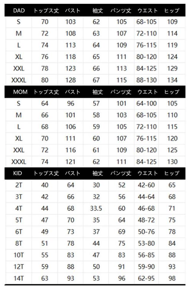 | サイズについての説明 | Dad-S Dad-M Dad-L Dad-XL Dad-2XL Dad-3XL Mom-S Mom-M Mom-L Mom-XL Mom-2XL Mom-3XL Kid-2T Kid-3T Kid-4T Kid-5T Kid-6T Kid-8T Kid-10T Kid-12T |