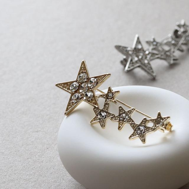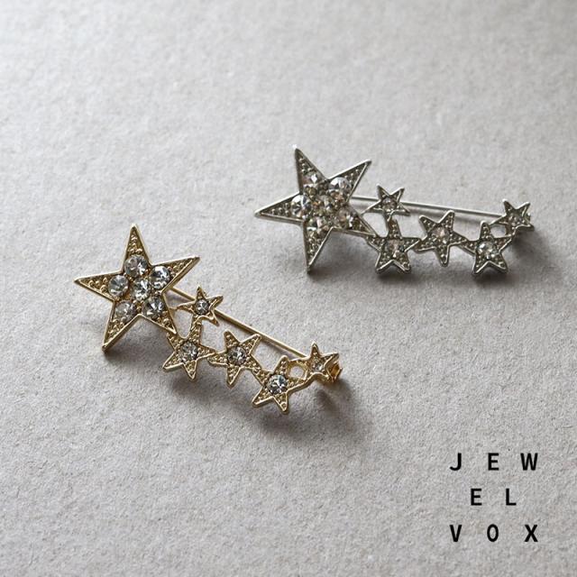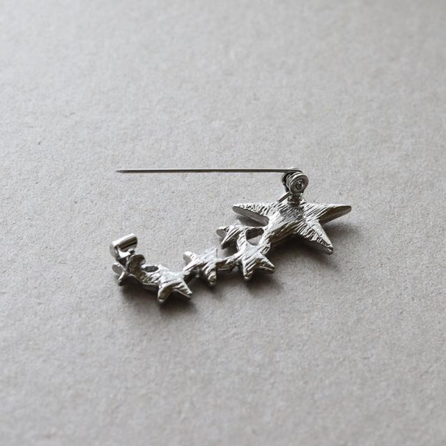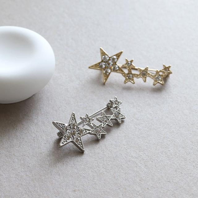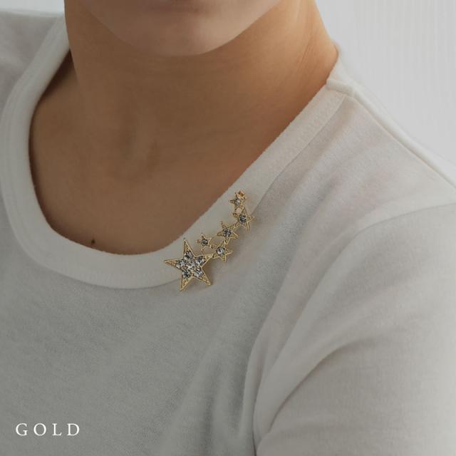 | コーデのアクセント使いにぴったりなスターモチーフのブローチです。 まるで夜空に散らばる星のように大きさの異なるスターモチーフがリズム良く配置されたデザイン。 煌めくラインストーンが美しく、ジャケットやストール、バッグなどデイリースタイルのワンポイントに活躍してくれます! | |
