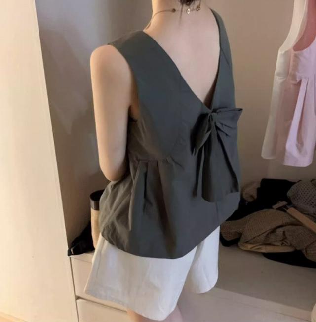 【バックコンシャス☆バックリボン ノースリーブ トップス】トップス レディース ノースリーブ タンクトップ バックリボン バックコンシャス シンプル 無地 ピンク ホワイト グレー 春 夏 可愛い オフィスカジュアル ペプラム シャツ ブラウス きれいめ 送料無料