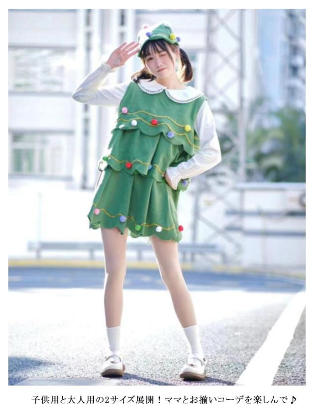 | 子供と大人サイズあり!可愛いツリー風ワンピース+帽子 3段フリルとカラフルなポンポンが目立ちます。 子供用と大人用の2サイズ展開!ママとお揃いコーデを楽しんで♪ | |