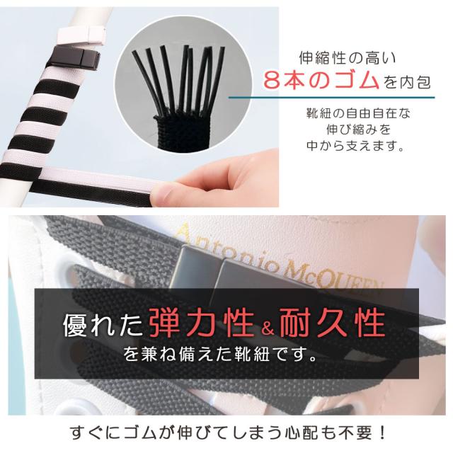 抜群の伸縮性を誇るゴム製靴ひもで、足の疲れを軽減し快適な履き心地を長時間サポートしてくれます。