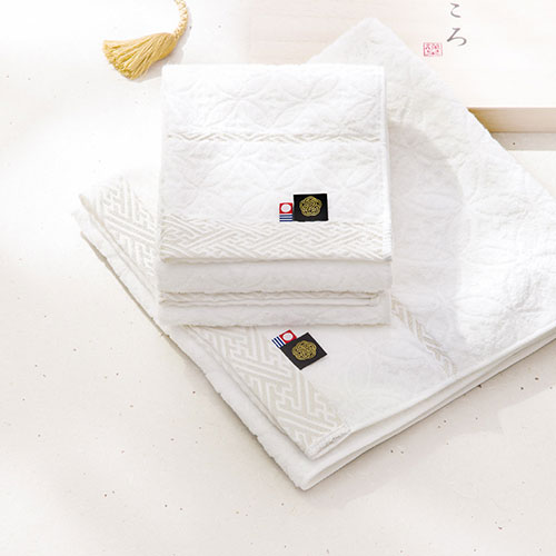 平安時代の女流歌人、小野小町が美しかったことから美しい女性の呼び名として使われる小町。今治で評判の美しい娘をイメージし、伝統の織技術を駆使して一つ一つ織り上げていく。そんなシリーズが今治小町です。お慶びの七宝柄を毛中のジャガードで表現、光沢の糸で紗綾形模様を地づり紋織でヘムを際立たせた高級感あふれる演出のタオルギフト。