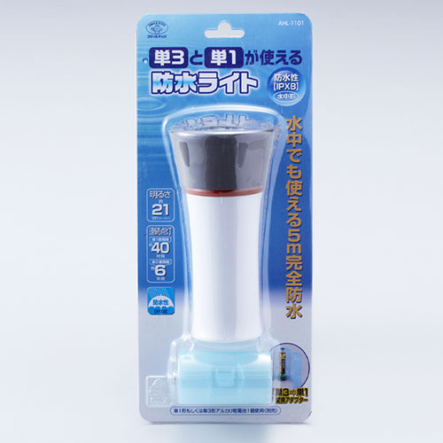 単3形アルカリ乾電池(電池交換アダプター使用)と単1形アルカリ乾電池のどちらも使える防水ライト。