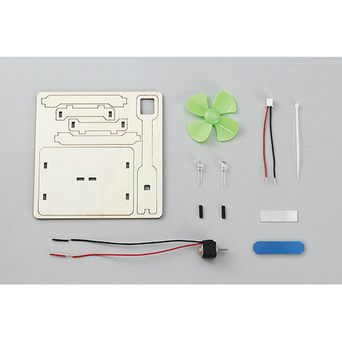 セット内容:台座×1、脚×4、モーター取付板×1、プロペラ×1、LED内予備1×2、キャップ×2、モーター×1、コネクター×1、結束バンド×1、両面テープ×1、やすり×1