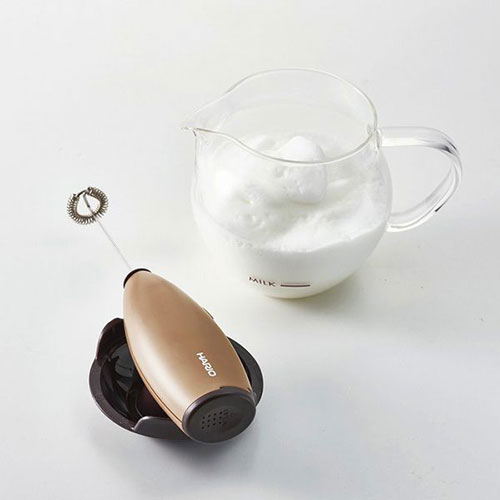 ○少し傾けスイッチを押し、ハンドルセットを30〜40秒程上下させ牛乳を泡立てます。