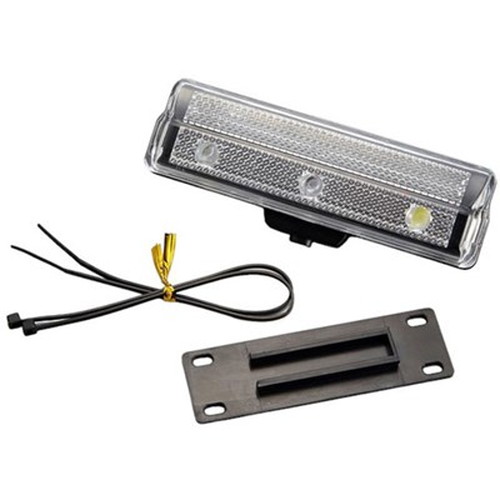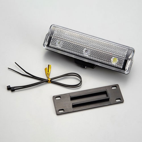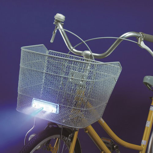 単4形電池2個仕様の3LED点灯/点滅式前かご用サイクルライトです。白色LED×2個と青色LED×1個を使用。
