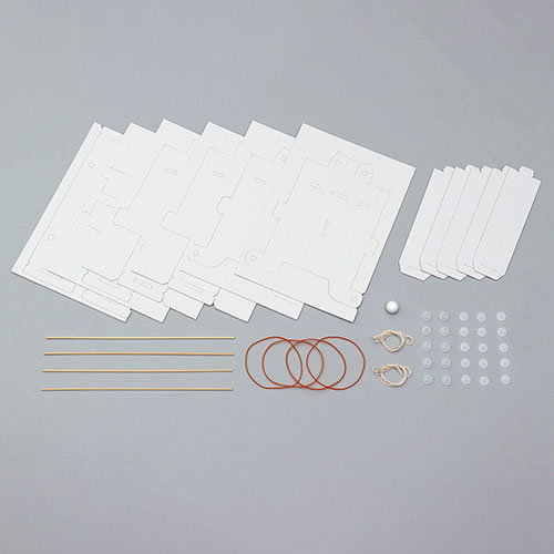 セット内容:ペーパークラフトパーツ×5、輪ゴム×4、たこ糸×2、発泡スチロール球×1、竹ヒゴ×2