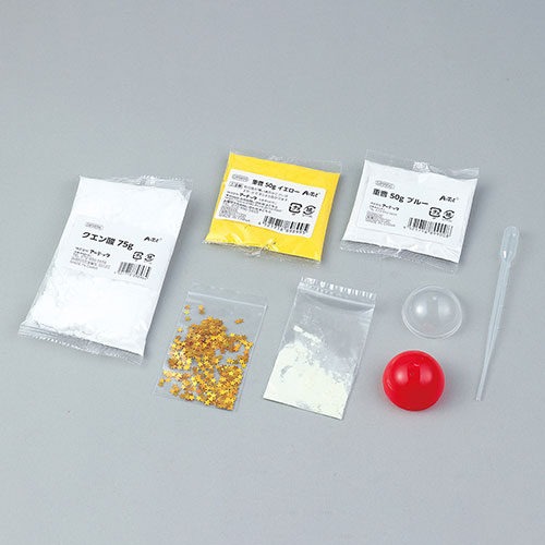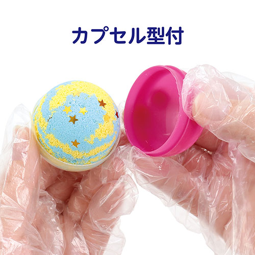 セット内容:重曹50gブルー×1、重曹50gイエロー×1、クエン酸75g×1、カプセルφ45mm上パーツ×1、カプセルφ45mm下パーツ(色取り混ぜ)×1、スポイト2ml×1、蓄光紛約3g×1、ホログラムグリッター星ゴールド0.5g×1
