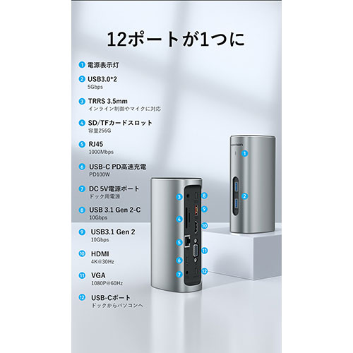 VENTION 12-in-1 USB-C タワードッキングステーション アルミニウム合金 グレー TP-8177 パソコン周辺機器(代引不可)【送料無料】