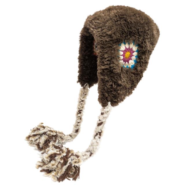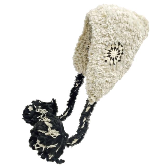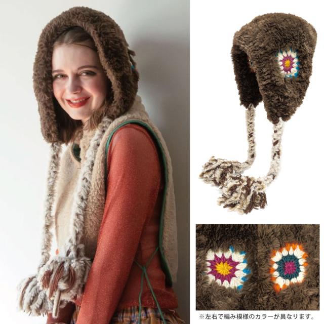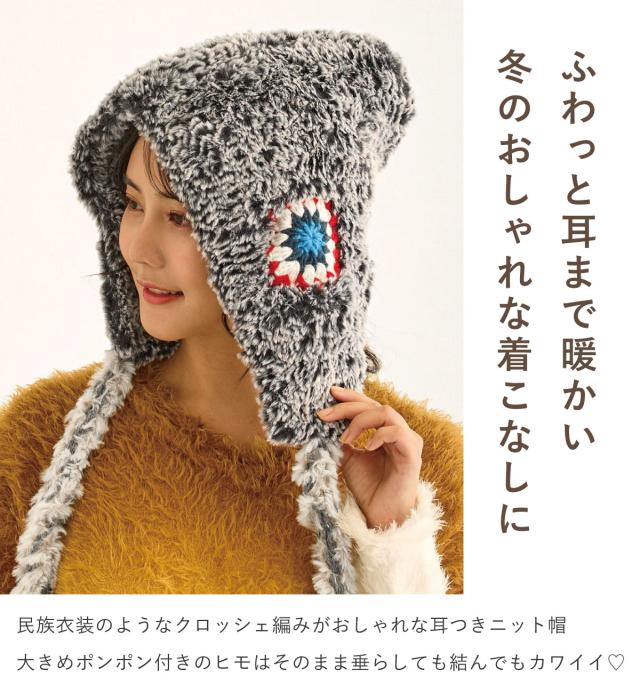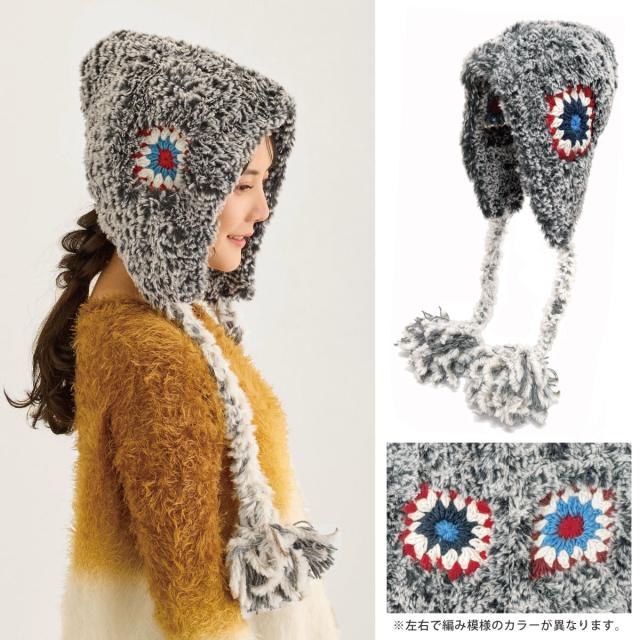 まるで民族衣装のようなクロッシェ編みが可愛い耳つきニット帽です