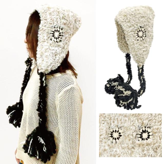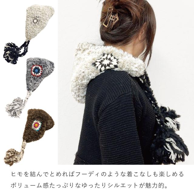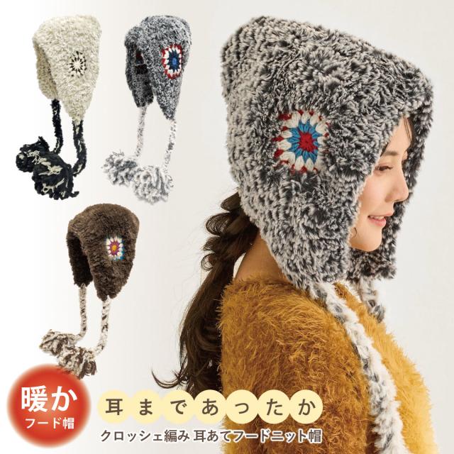 フード ニット帽 ファー 耳あて付き 帽子 クロッシェ編み ウール混 耳まで暖かい 揺れるBIGポンポン 民族風 バブーシュカ 冬 レディース あったかフード帽 knit-1726 防寒 チャイハネ 耳あて ニット 可愛い バラクラバ お洒落 プレゼント 即納