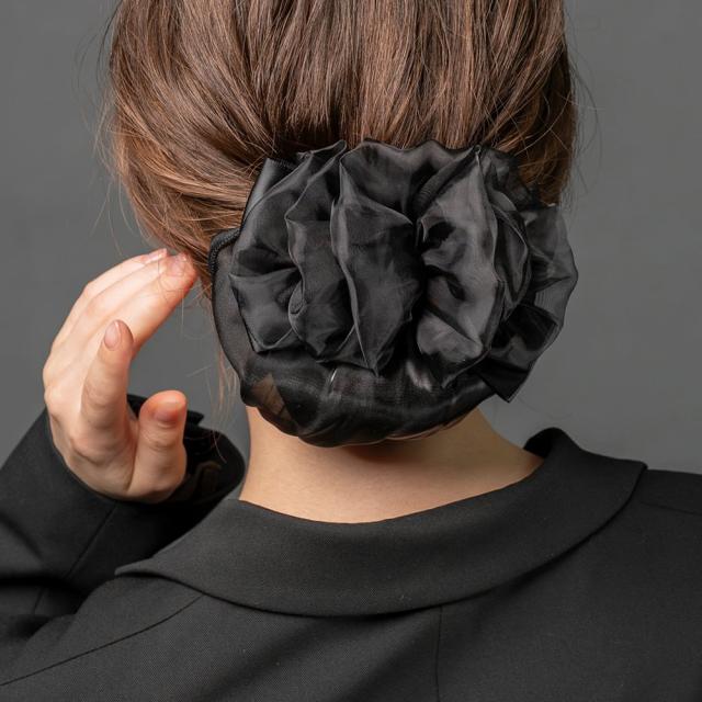 【ゆうパケットOK】 シニヨンネットフリル リボン 立体 透け感 お団子 シニヨン バレッタ まとめ髪 髪留め お団子ネット お団子カバー ネット付きバレッタ 簡単 無地 ポニーテール ヘアアレンジ 大人 黒 ブラック outlet