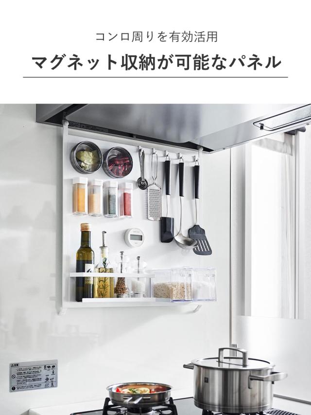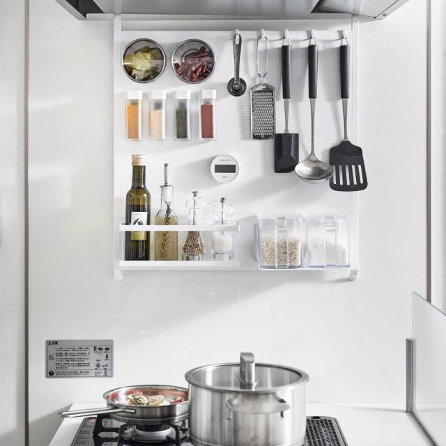 レンジフードの折り返し部分に引っ掛けて、自分だけのオリジナル収納を作ることができるスチールパネルです。マグネットが付かないことで諦めていた壁面収納を可能にしてくれる便利なアイテムです。