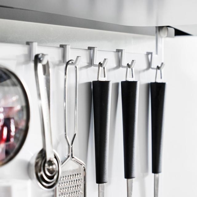 設置場所を調節できる差し込み式のフック付きです。フックにキッチンツールを掛けて収納できるので、調理中にすぐに手に取れて便利です。