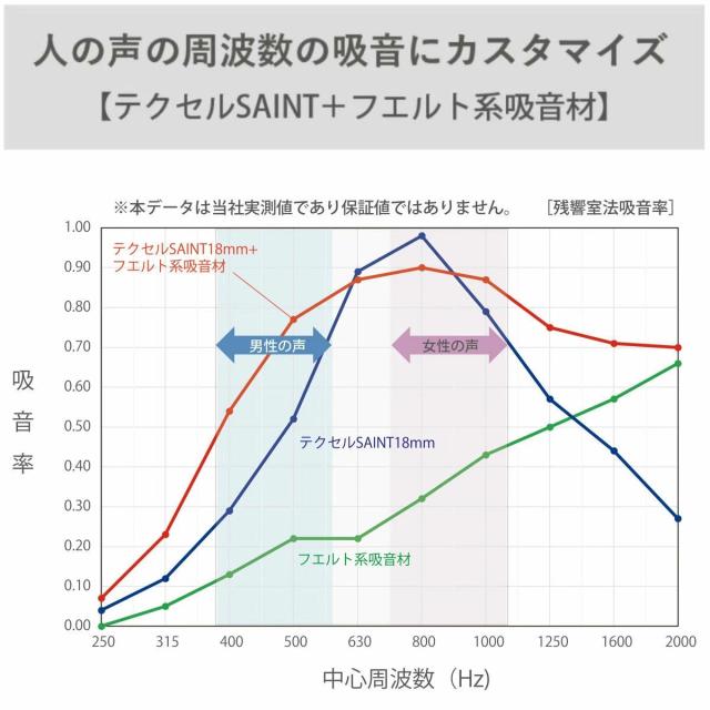 テクセルSAINTに、フエルト系吸音材を貼り合わせることで、人の声の周波数帯の吸音に特化したカスタマイズをしています。