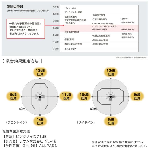 一般的な事務所内の騒音値は55dB〜65dBです。10dB下がると、美術館や書店内の静けさになります。