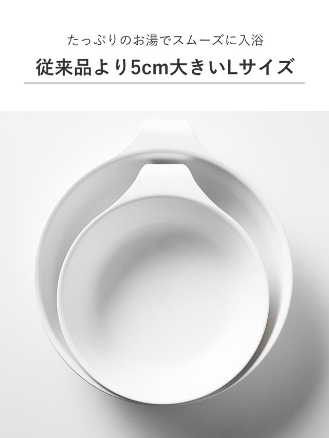 従来品よりも5cm大きくなった湯おけです。身体全体を洗う際に何度も湯を汲み替える必要が減り、よりスムーズな入浴が可能になりました。