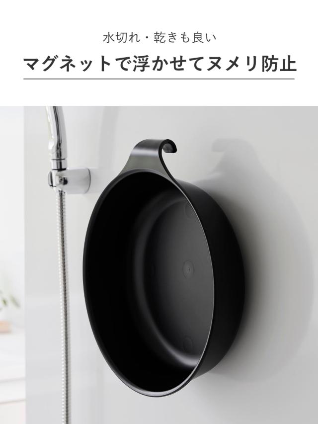置き場所に困る湯おけを、マグネットで簡単に壁面収納できます。水切れが良く乾きやすいので衛生的です。浴室のカウンターや床に置かない事で、お掃除もラクになります。