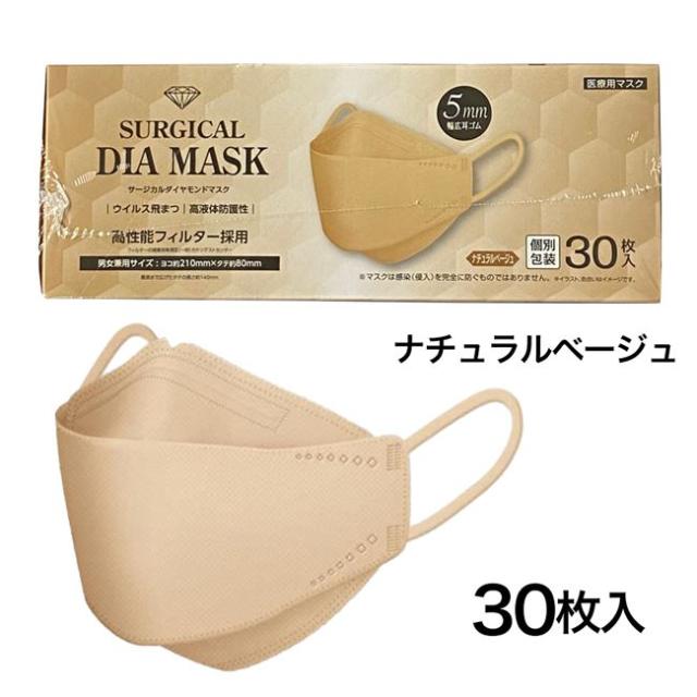 「サージカルダイヤモンドマスク ナチュラルベージュ 30枚」は、ダイヤモンド立体構造で口元とマスクの接触による不快感やメイク崩れを軽減します。隙間を軽減するVカットデザイン+フィット感を高めるため、5mm幅のノーズフィットを採用しました。長時間マスクを着用しても耳が痛くなりにくい5mm幅広ゴムを採用しています。医療用JIS規格取得。