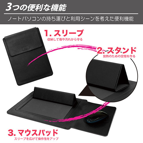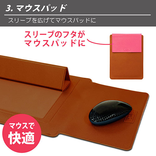 スリーブタイプ保護ケース、スタンド付きデスクマット、マウスパッドの3つの機能を一体化。