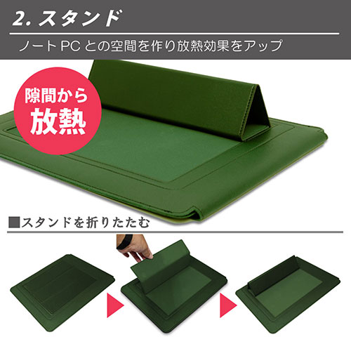 手軽に収納できるスリーブケースの外装には、傷や汚れからノートPCを守る手触りの良いPUレザーを採用。内側は起毛加工で傷を防いでいます。