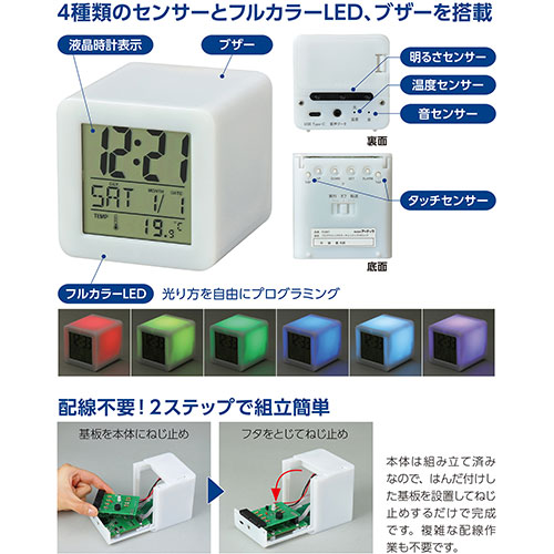 ●4種類のセンサー(明るさセンサー、温度センサー、音センサー、タッチセンサー)とフルカラーLED、ブザーを搭載