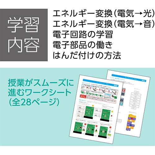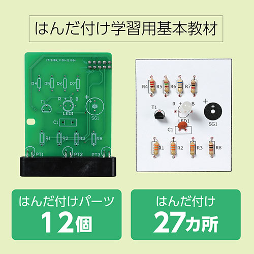 セット内容:本体×1、基板×1、電子部品台紙×1、ブザー×1、はんだ×1、ネジ×3、USB(AtoC)ケーブル×1、ステレオミニプラグケーブル×1、名前シール×1