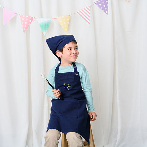 ・エプロンもバンダナもゴムタイプで着脱も楽々です。