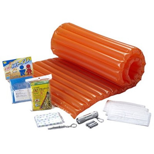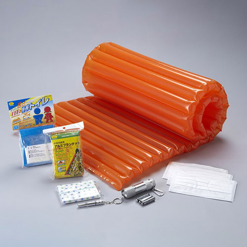 ・棚にすっぽり入って、持ち運び便利な防災用7点セット(エアマット120cm、ミニアルミライト(点灯確認用電池付き)、アルミホイッスル、非常用携帯アルミブランケット、携帯トイレ、マスク3枚、ポケットティッシュ)です。