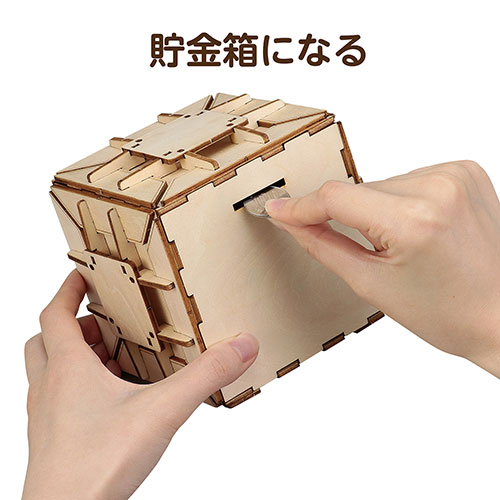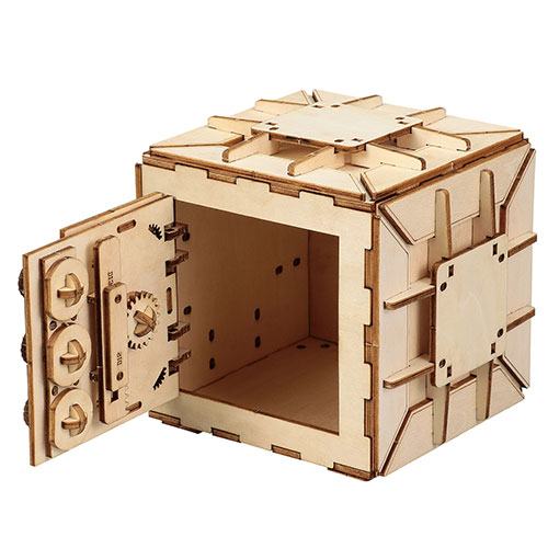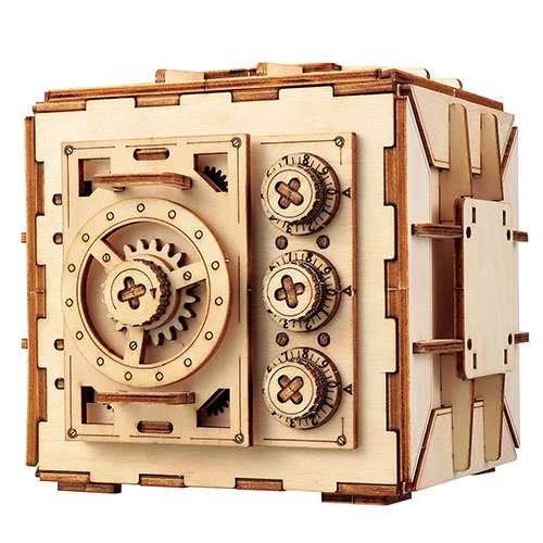 接着剤や工具なしで本格的なダイヤル式金庫型貯金箱が作れるクラフトキット。