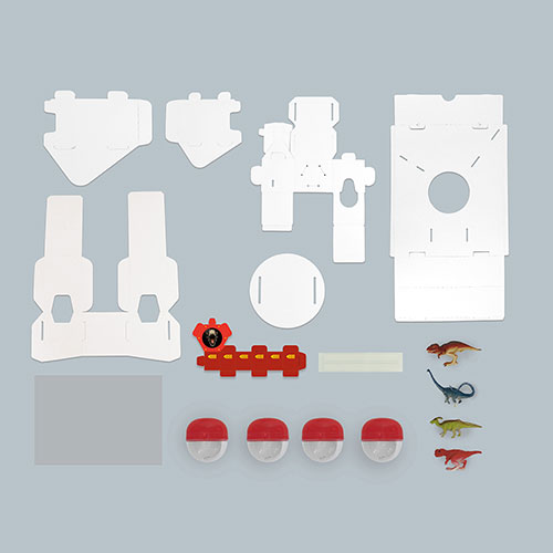 セット内容:ペーパークラフトパーツ×8、プラ板×1、カプセル×4、恐竜フィギュア×4(8種から取り混ぜ)、両面テープ×2