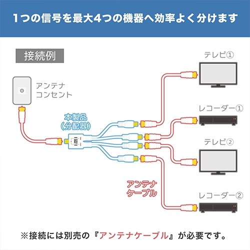 1つのアンテナ信号を効率良く分配します。本製品を使用することにより、レコーダーなどの周辺機器や、別室にあるテレビなど、4台の機器へ分配した信号を送ることが可能になります。