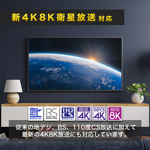 従来の地デジ、BS、110度CS放送に加えて、最新の4K/8K放送にも対応しています。