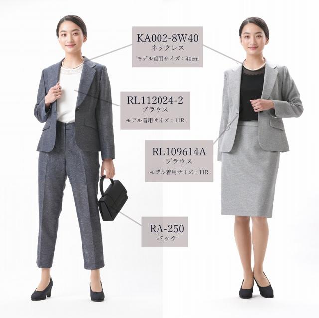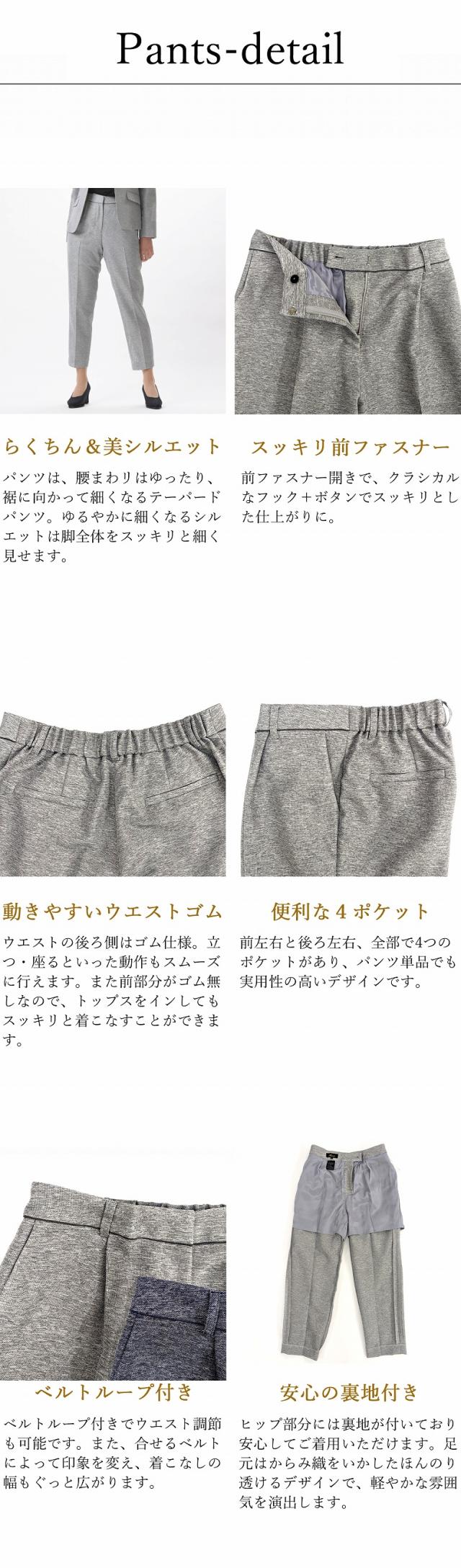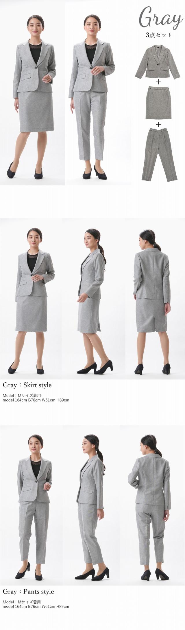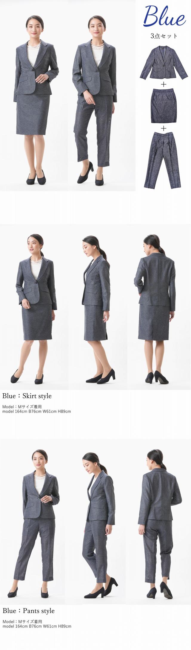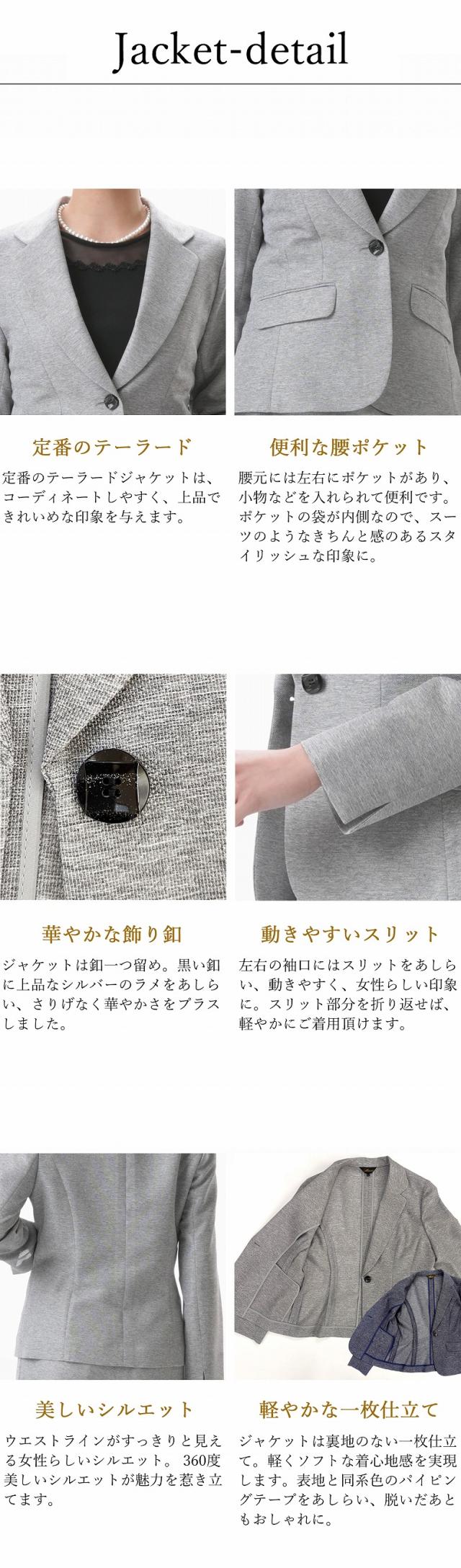 | デザイン | ジャケット: 肩パッドなし / 袖口スリット / 左右ポケット / 裏地無し スカート: 裏地あり / 後ろファスナー / 後ろ中心ベンツ パンツ: 部分裏地 / 後ろウエストゴム / 前ファスナー / 前左右・後ろ左右ポケット / センタープレスあり |