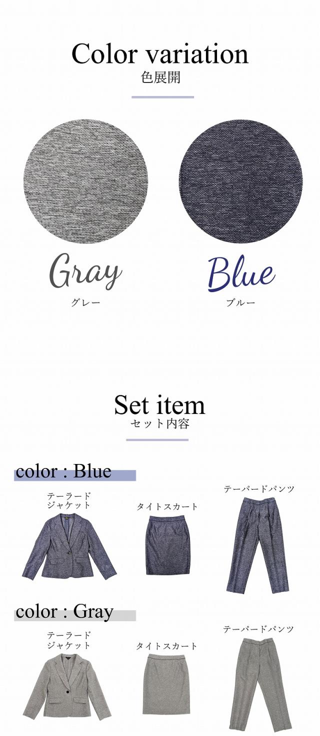 スーツは合わせやすいテーラードジャケットに、定番のタイトスカート、きちんとしつつも腰まわりが楽なテーパードパンツの3点セットです。それぞれ単品としても活用できます。