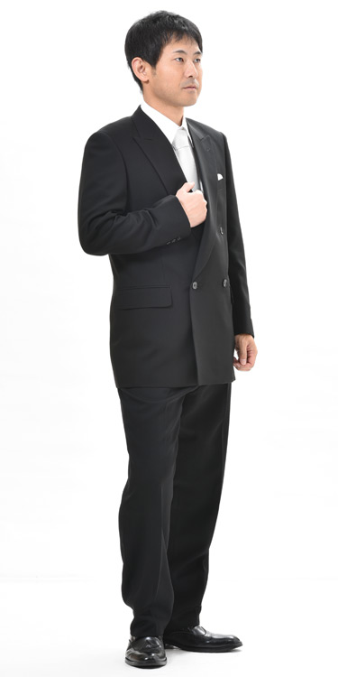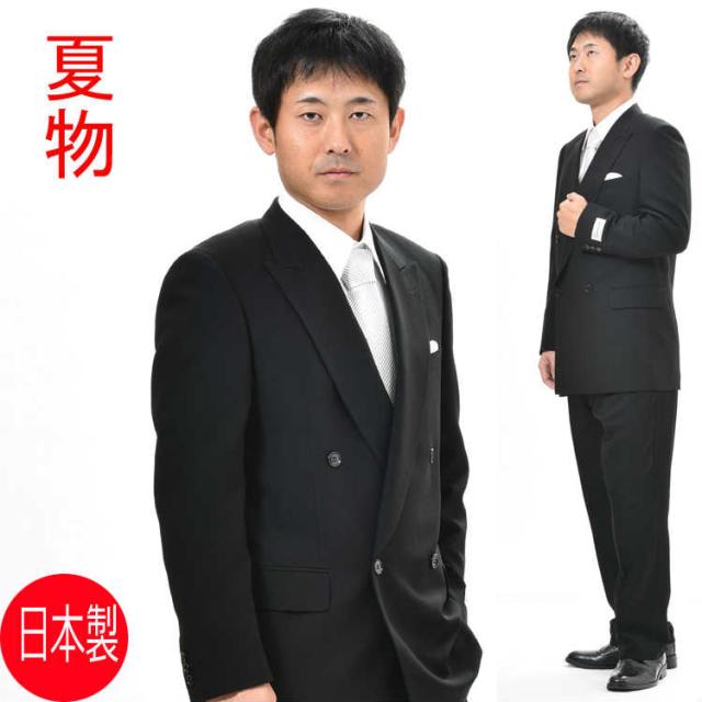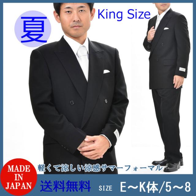 夏用 日本製 ブラックスーツ :RM18160 【大きいサイズ E体 K体】ダブル 略礼服 喪服【4B×1:アジャスター付き★パンツ裾未処理】黒 メンズ 紳士 ブラックフォーマル ビッグサイズ 黒 冠婚葬祭 葬儀 葬式 通夜 法事 法要 礼装 サマーフォーマル
