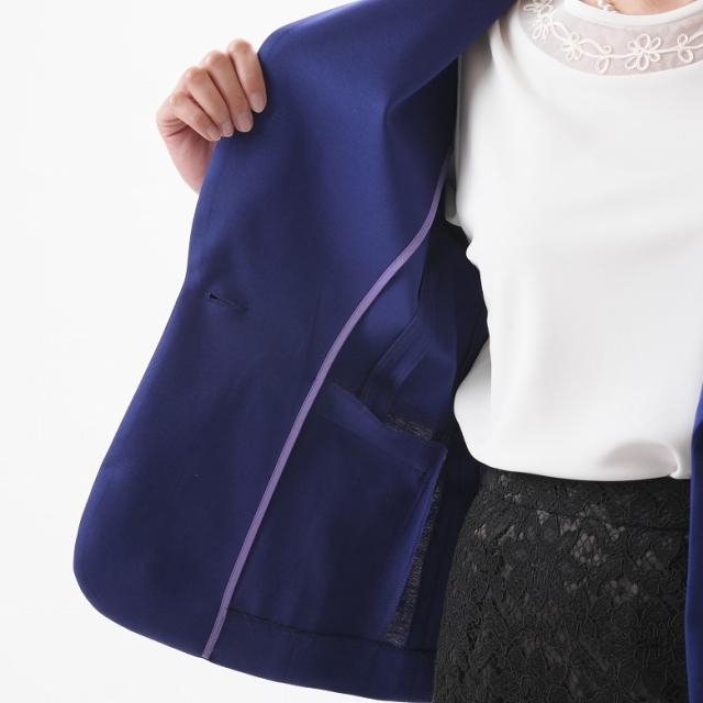 背中心と前見返し端にパープルのパイピングを使用し、脱いだ裏側もおしゃれ。