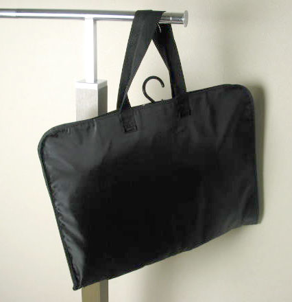 ロングサイズのコートやドレスもコンパクトに持ち運べる三つ折りのキャリーバッグに黒ハンガーがついています。レディース&メンズ商品の持ち運び用バッグや収納用として使用することができます