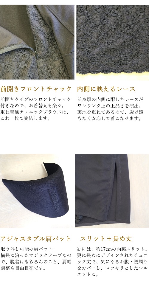 ストレッチ素材を使用したブラウス。内側のレースが華やかで女性らしい印象を与えます。