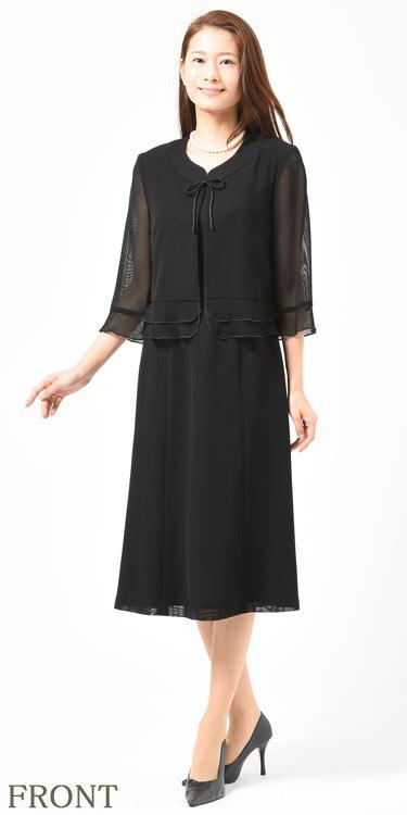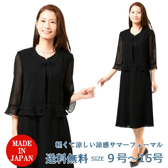 【夏用】ブラックフォーマル ワンピース :RL11426 レディース 婦人 礼服 喪服【日本製】【9号〜15号】黒 大きいサイズ【リボン取り外し可】 冠婚葬祭 葬儀 葬式 通夜 法事 サマーフォーマル 礼装
