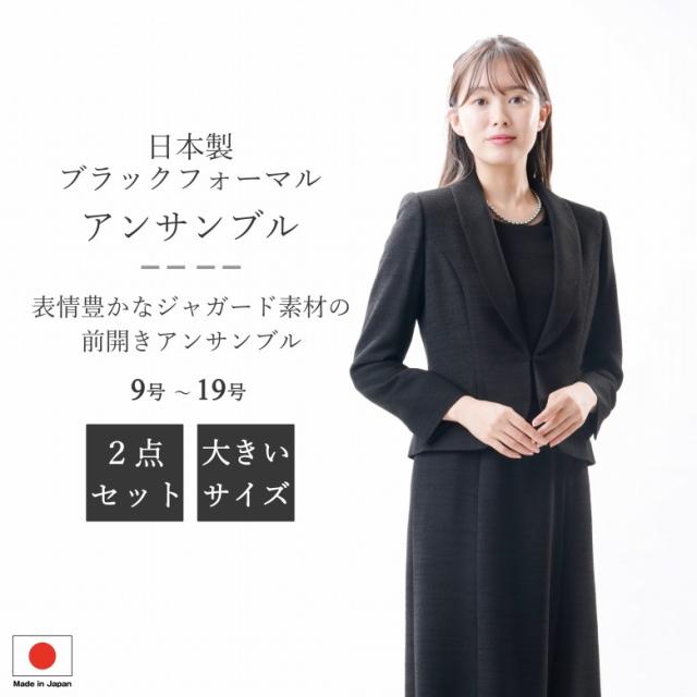 ブラックフォーマル アンサンブル GD16202orGD16214レディース 婦人 礼服 喪服 前開き 黒 大きいサイズ 日本製 9号から19号 冠婚葬祭 葬儀 葬式 通夜 法事 卒園式 卒業式 七五三 お宮参り 結婚式 礼装 ジャガード生地の2柄からお選びいただけます。