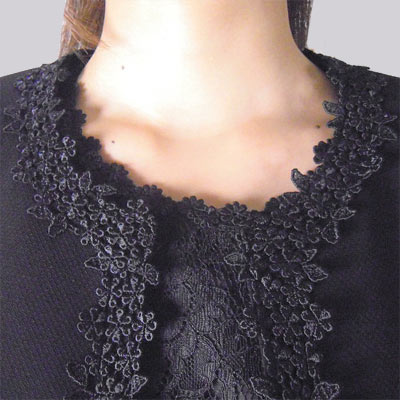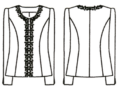 | ジャケットの衿はシンプルなノーカラーに豪華なレースを施して華やかな印象に仕上げました。 | |||