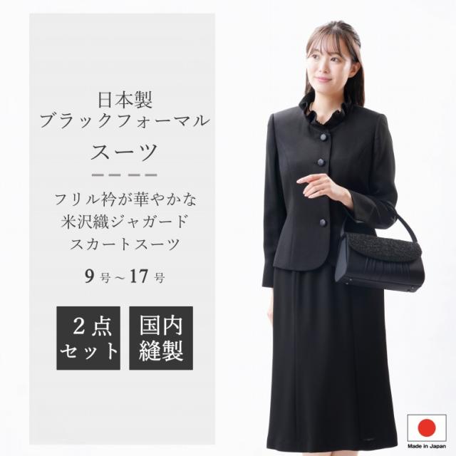 日本製 国内縫製 合物 レディース ブラックフォーマル スカートスーツ 礼装 喪服 20代 30代 40代 50代 60代 9号/11号/13号/15号/17号 送料無料 フリル衿 ボタン留め マーメイドスカート
