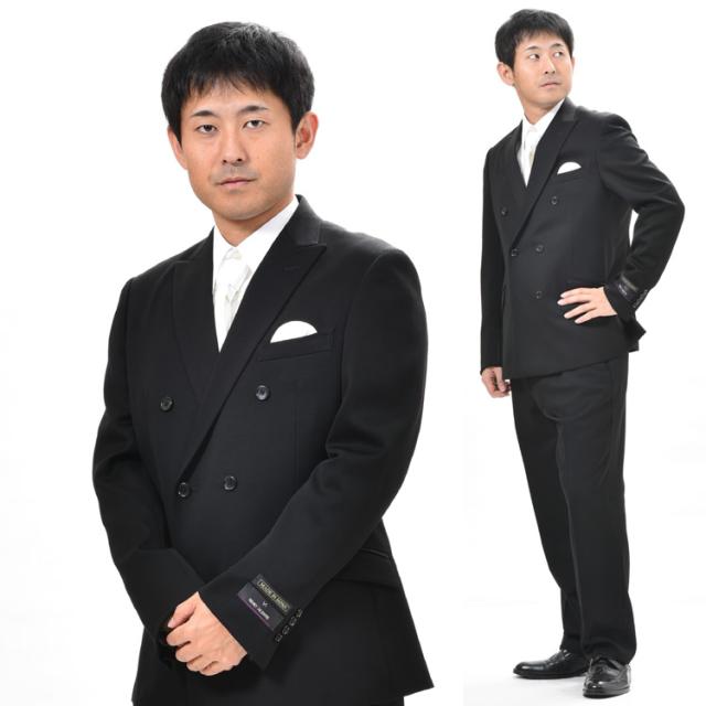 【日本製】*合服*ブラックスーツ :ダブル6B×2略礼服、喪服:サイドベンツ:ノータック アジャスター付き:RM12040:当店で一番トレンドの高いダブル★パンツ裾未処理