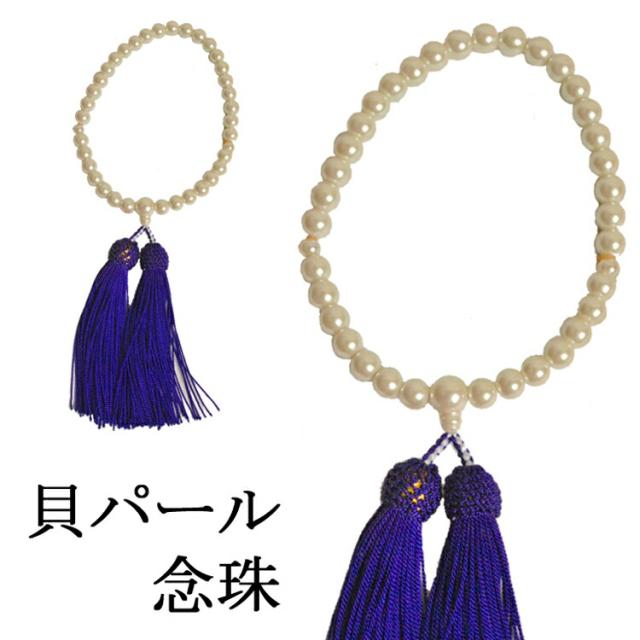 即日発送 女性用 貝パール念珠 ネンジュ R-013 ケース入り 7mm玉 貝パール オフホワイト色】房は紫 レディース 婦人 数珠 念誦 日本製 弔事 葬祭 葬儀 葬式 法事 通夜 法要 仏具