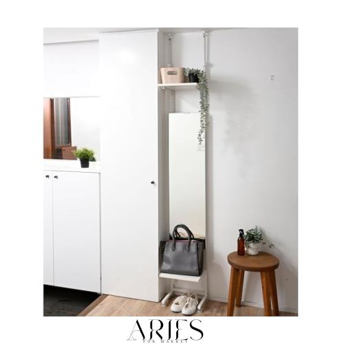 【タテのスペースを有効活用】突っ張って設置するので場所をとらず、天井近くのデッドスペースまでタテの空間を有効活用できるミラー付きラックです。 【突っ張り方式】突っ張り式で壁や天井に穴を開けずに設置できるので、賃貸物件にお住まいの方にもおすすめです。立て掛け式のように斜めにならず、真正面に鏡を設置できます。 【奥行スリム】奥行は約28cmとスリムなので玄関や廊下などの狭い場所にも設置しやすいです。玄関周りでお出かけ前の身だしなみチェックや、お部屋に置いてドレッサー代わりにも使えます。 【棚板付き】棚板は2枚ついています。ミラーや棚板の位置は変えられるので、お好みで調節できます。